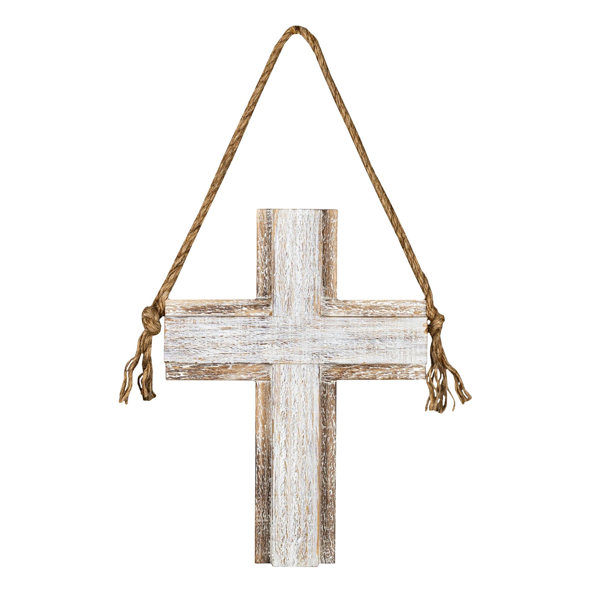 A creative, whitewashed wooden cross paired with a thick jute rope hanger. The inner cross is raised from the outer cross, creating a dimensional wall art piece. The traditional cross adds character to your gallery wall or hung on its own for a unique piece of wall art. 1 inset keyhole hanger; additional decorative hanger is a thick jute rope -Dimensions: 8.75 x 1.5 x 12"H; Hanging Height: 18". -Material: Wood & Rope -Whitewashed wood paired with jute offers a soft and airy look.