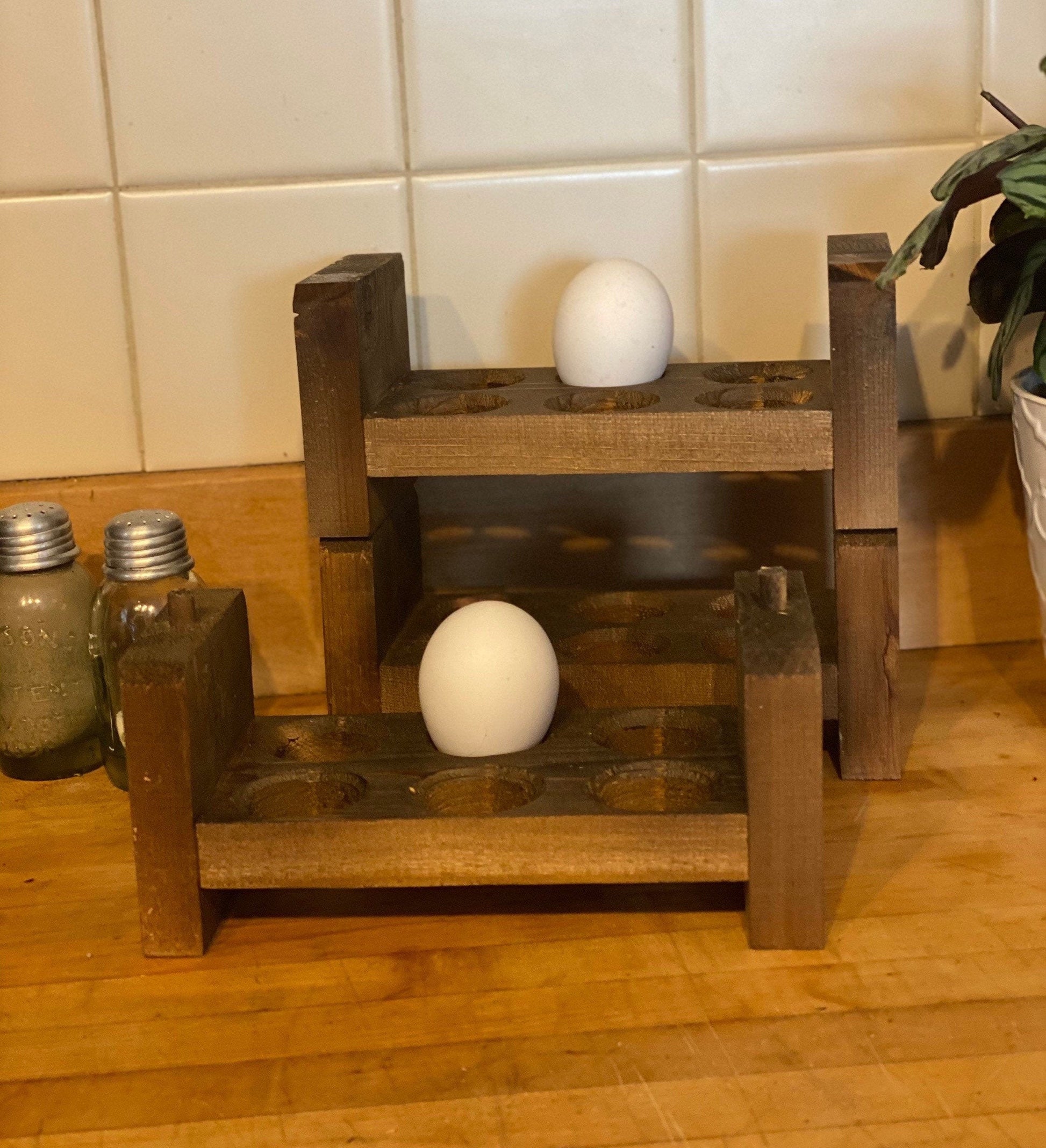 These stackable egg holders are a great way to store your fresh unwashed eggs on your counter! They are made of cedar wood to last a long time. Each egg holder is hand-crafted with love. Do to the nature of hand-crafted items, no egg holder will be exactly like another and may have minor imperfections. We strive to give each customer a quality item that adds the rustic charm of farm-fresh eggs in their kitchen. If you have any questions about this item, please message us and we would be happy to answer them.