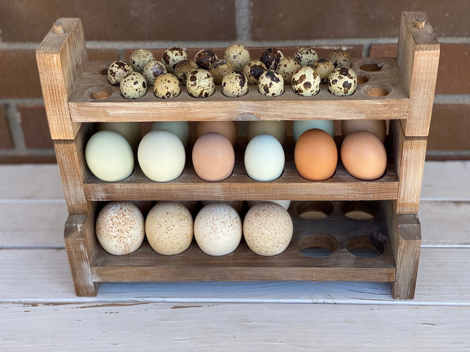 This Wooden Egg holder will fit multiple egg sizes! The top layer fits quail eggs, the middle fits chicken eggs, and the bottom layer fits duck eggs! We designed this set to fit all your different egg size needs!
